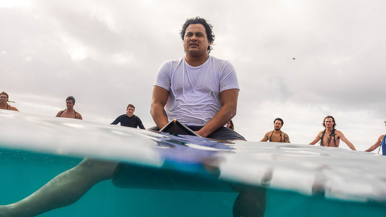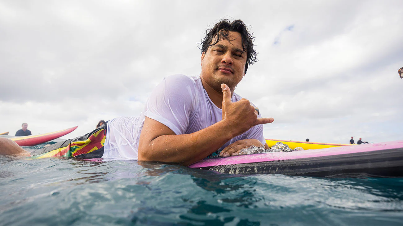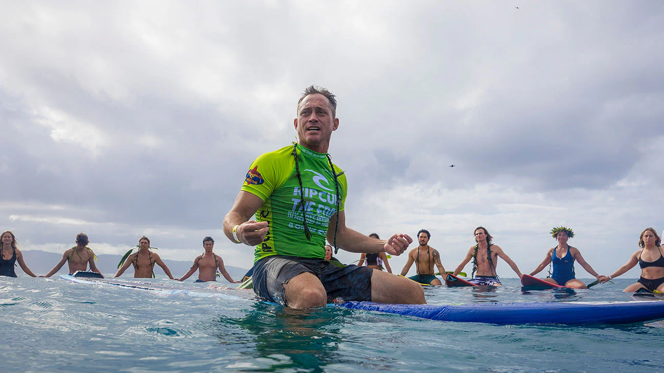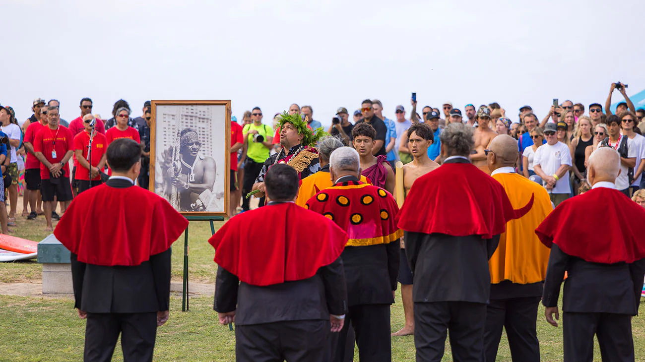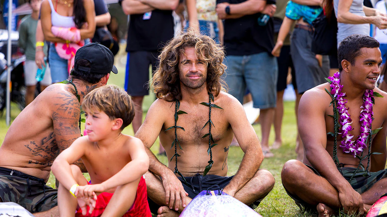 クライドの息子であり2025年招待選手のハア・アイカウ、そしてマクア・ロスマンに導かれ、ワイメアの海で伝統的なオーシャン・ブレッシングが行われた。